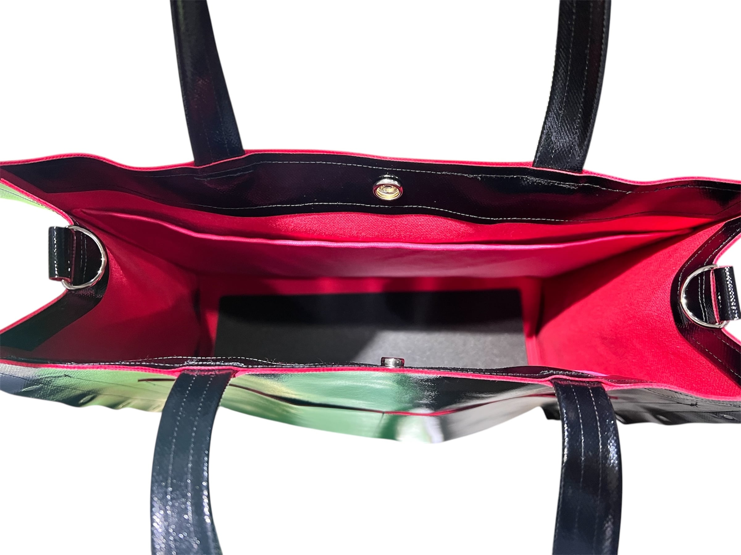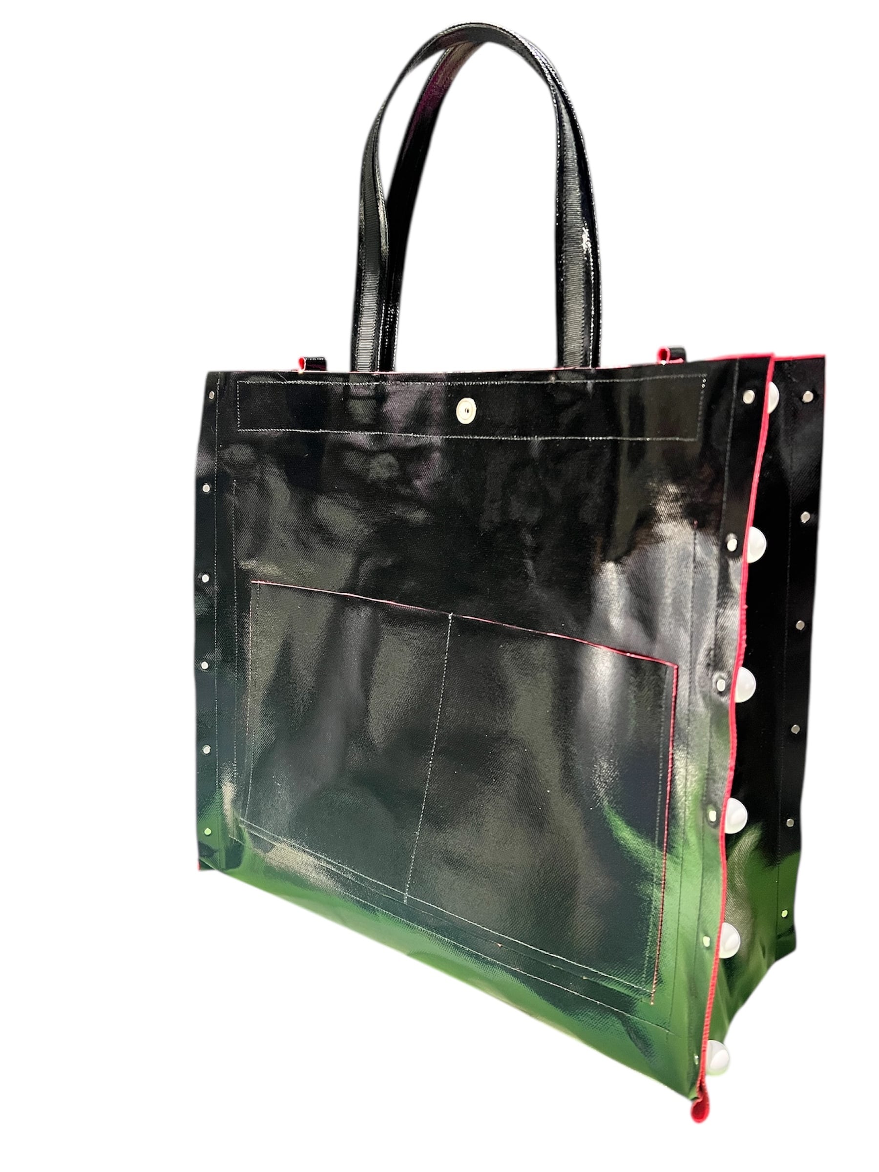 素材からこだわり、帆布生地上に、PVCツヤ加工を施したオリジナルのエナメル生地を生産、