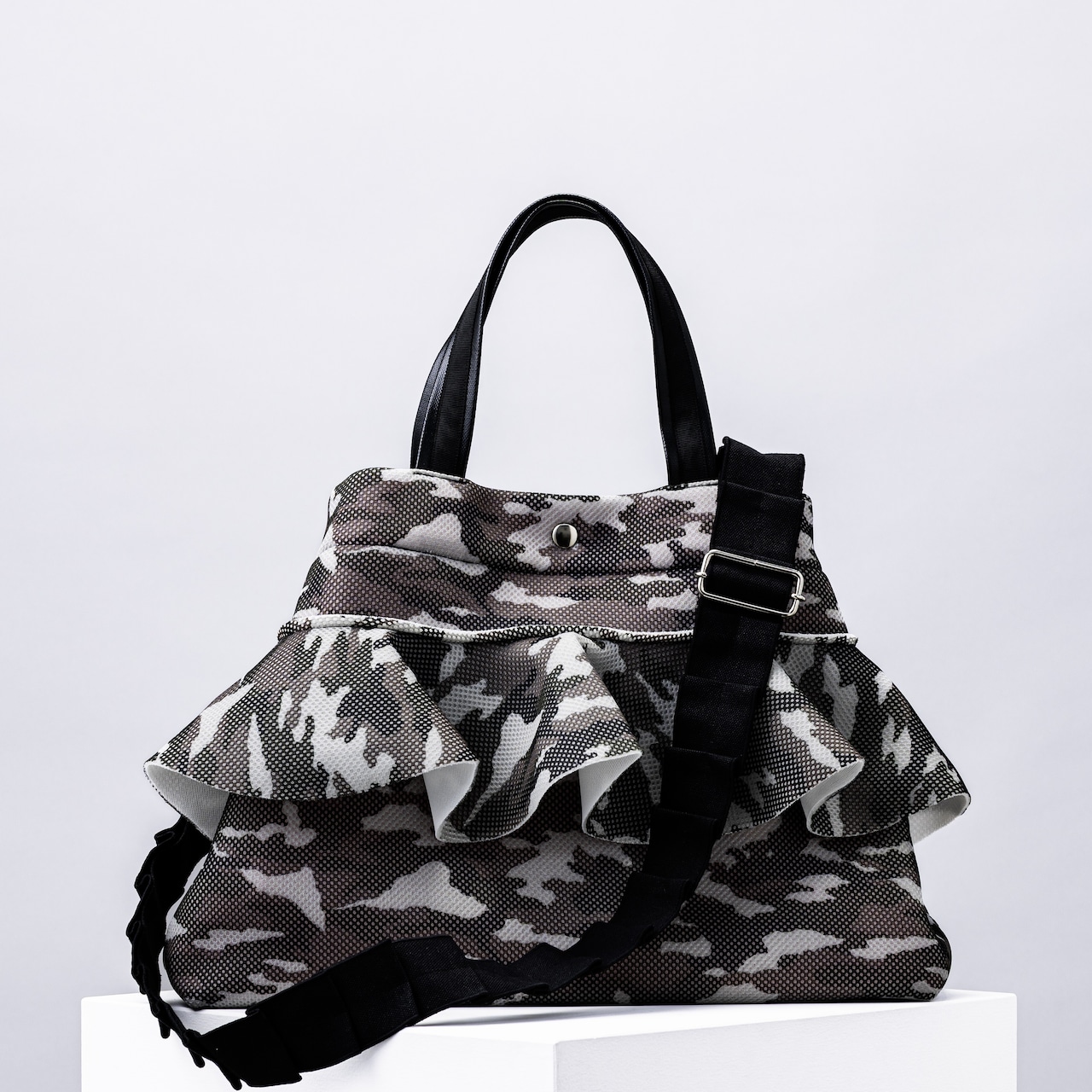 立体的なラッフルのドレープが特徴的なデザインのバッグです。